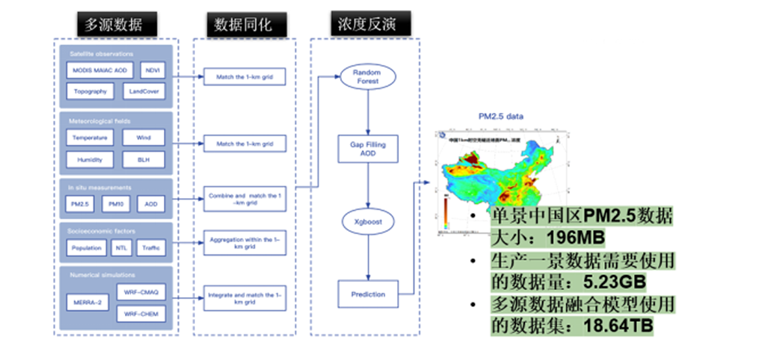 基于多源数据,使用机器学习和深度学习方法对逐日地面颗粒物浓度进行估算;分辨率可达0.01°x0.01°;同时,使用多源AOD数据生成无缝AOD数据,再使用无缝AOD数据生成全国无缝颗粒物浓度,最终实现了利用基于AI技术的星-地-模多模数据近实时遥感反演方法,对环境质量相关的参数进行反演,提高了反演的效率和精度。
